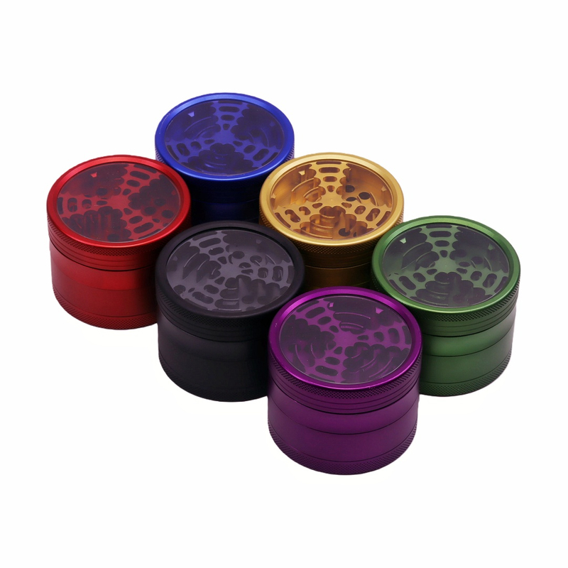 Full 4-layer aluminum alloy construction includes a magnetic transparent lid, windmill grinding chamber, removable fine mesh screen sifter, and dedicated pollen catcher chamber—all-in-one for grinding, sifting and pollen collection.