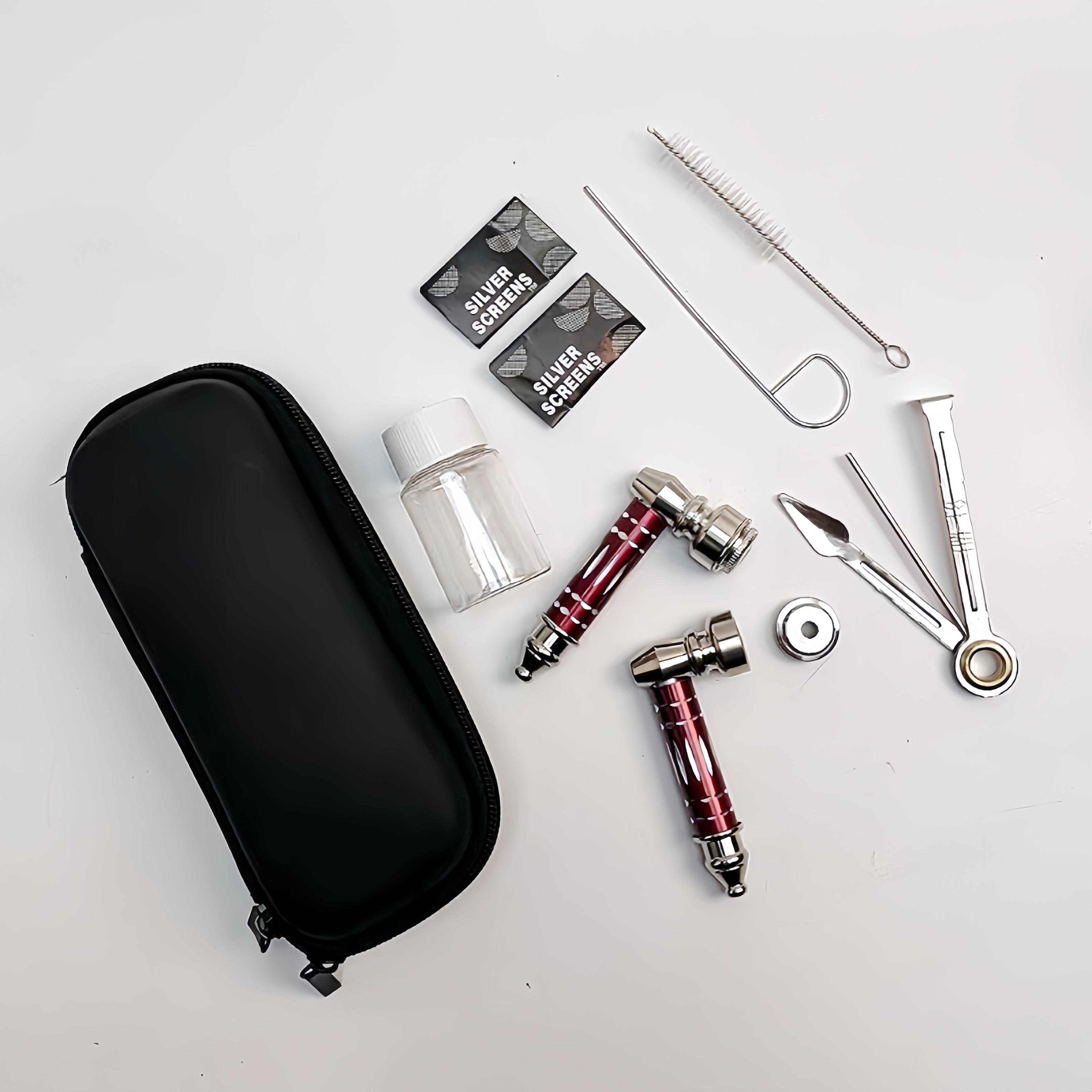 (1 PU Bag,2 Booklets(5pcs) Silver Pipe Screen, 1 pc Poker, 1pc Brush, 2pcs Diamond Cuts Metal Tobacco Pipes With Lid)