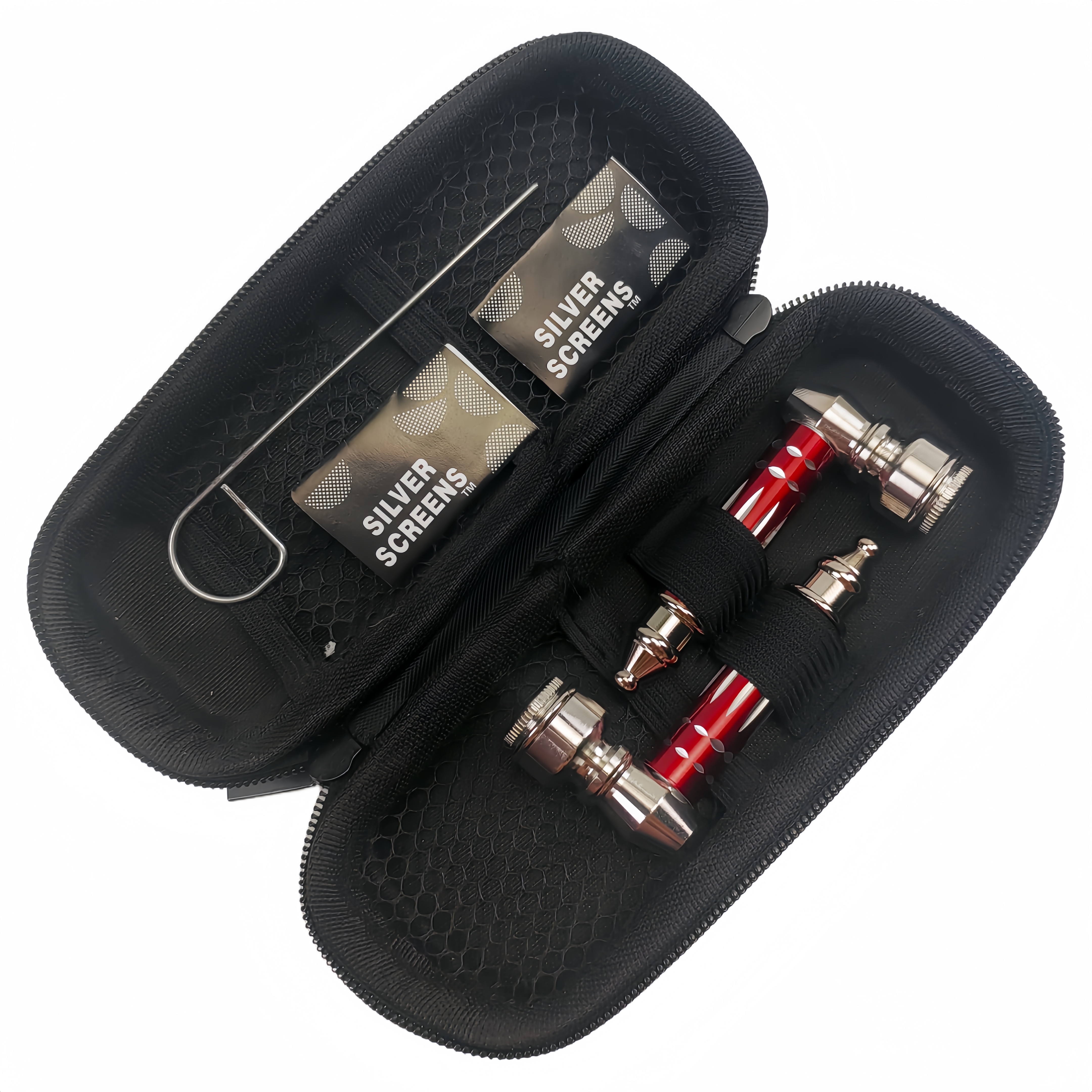 Package: 1 Kit(1 PU Bag,2 Booklets Silver Pipe Screen, 1 pc Metal Rod(Cleaner), 2pcs Diamond Cut Metal Tobacco Pipes )