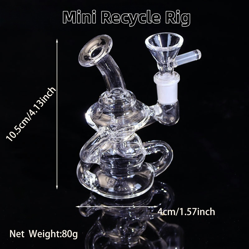 Smoothness is the name of the game with this 4-inch tall Mini Dab Rig Recycler. It's made from handblown borosilicate glass and equipped with a 10mm female joint and a fixed downstem. It comes with a 10mm glass-on-glass quartz banger that's ideal for dabbing.
